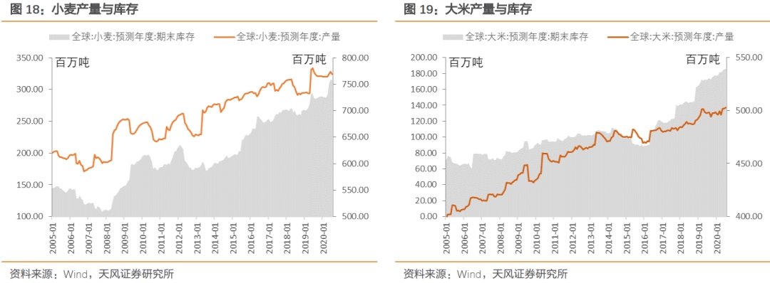 从国内来看,统计局数据显示,全国夏粮总产量14281万吨,比2019年增加120.8万吨,增长0.9%,同时我国主要粮食库存处于较高水平。当前粮食价格上涨与农民阶段性“惜售”有关。粮食价格存在上涨风险,但预计涨幅低于2010年水平。