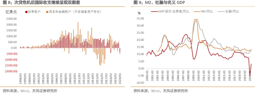 本轮刺激过程中,经济尚未全面企稳的情况下货币政策较早地回归中性,同时要求“保持货币供应量和社会融资规模合理增长”,信用扩张大概率放缓;如果发达国家继续长期维持货币极度宽松状态,当前中美利差之下可能还是会出现资本流入。不过目前还是有一些不同之处:中美关系面临较大不确定性,国际贸易争端增多,经常账户难以持续维持顺差状态;央行对汇率浮动容忍度增加,同时增加了应对资本流入的宏观审慎工具;因而,虽然金融扩大对外开放,但目前还看不到次贷危机之后热钱大规模流入导致货币显著被动超发的局面。