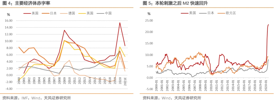 本轮刺激更多地集中在企业和居民,而非金融机构,同时财政政策作用更加突出(特别是美国),这导致M2快速回升,而次贷危机之后由于流动性囤积美欧日广义货币长期处于低位。