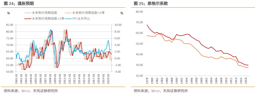 综合来看,全球流动性宽松力度高于前期,国内货币增速亦有明显提升,这隐含了较大的潜在通胀风险,这是2021年与2010年比较相似的地方。但当前还是有许多不同之处:逆周期力度明显较弱,经济出现过热的可能性不大,货币扩张速度有限且趋于缓和,资本流入导致货币被动超发的可能性存在但规模大概率不及前期;当前处于猪周期下半年,猪通胀压力不大;经济恢复和流动性泛滥大宗商品价格预计上涨,但原油供需格局发生明显变化,而且未来还有一段去库存时期;国际粮食危机可能性较小,当前粮价上涨可能只是阶段性的;工资增速出现趋势性下降,失业压力之下劳动力成本增幅预计有限;疫情之后居民消费恢复偏弱,通胀预期还没起来,这也降低了未来通胀风险。
