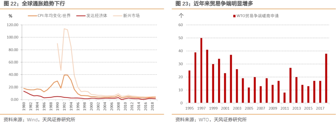 逆全球化愈演愈烈。20世纪90年代以来,全球通胀水平整体趋势下行,近年来中国CPI波动率也出现下降。对于这种现象,2017年BIS首席经济学家波里奥表示全球化是造成通胀低迷最可能的原因[2]。当然,人口老龄化、技术进步、贫富差距加大等都可能是重要原因。不可否认的是,全球化使得企业可以更好地优化资源配置、降低生产成本,这在一定程度上缓解了消费品价格上涨。2018年以来全球贸易争端增多,本次疫情将全球供应链的弱点充分暴露,逆全球化可能愈演愈烈,当前强调内循环也是基于这一大背景。逆全球化和全球供应链割裂可能会导致生产成本增加,当然具体影响还有待观察。