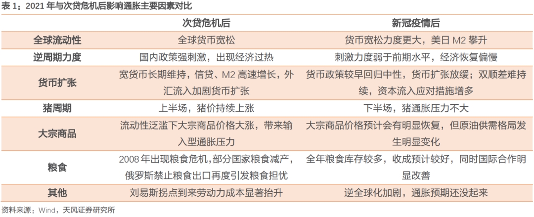 当前的超级大宽松与次贷危机之后有很多相似之处,但本次国内逆周期力度、货币扩张速度、猪周期位置、原油供需格局、粮食形势以至通胀预期等等都有明显的区别,因而未来通胀的路径预计不会是金融危机之后的简单重复。