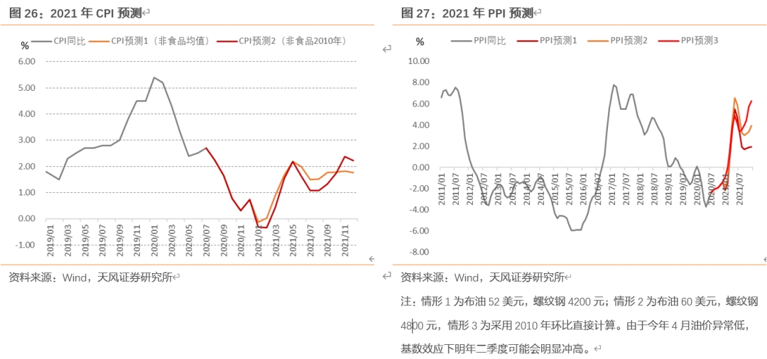 对于PPI预测,我们整体的判断是:如果全球经济没有较好地实现同步改善,2021年原油、螺纹钢等大宗商品不会超过2017年水平。根据EIA的预测原油价格回升斜率并不陡峭,2021年布油现货价预计回到52美元附近,假设最高回到60美元。对于国内定价属性更强的螺纹钢,考虑到国内基建地产投资增速相对温和,螺纹钢价格预计在4200-4800元/吨[3]的区间。此外,我们还直接使用2010年环比作为替代计算2021年PPI同比。综合来看,PPI整体走势基本一致,上半年呈上升趋势,由于基数较低5、6月达到最高值;短暂回落之后9月前后再度上行,全年PPI最极端情况可能是6%(2010年环比),中性假设下可能在3%附近,如果经济恢复不及预期可能在2%-3%的位置。