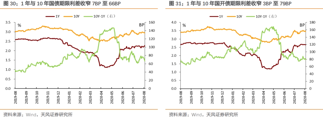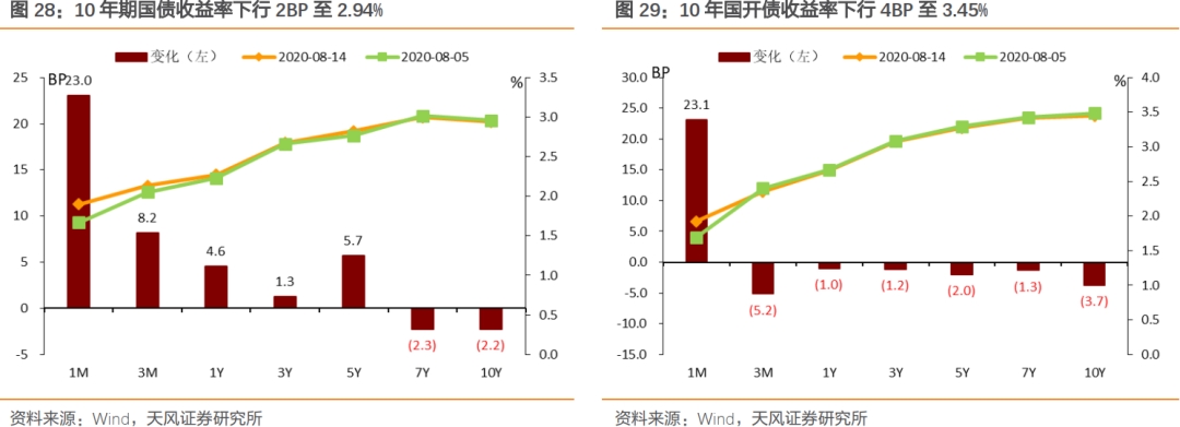 本周央行公开市场净投放4900亿元,资金面中性偏紧,公布的七月宏观经济数据不及预期,长债收益率小幅下行。全周来看,10年期国债收益率下行2BP至2.94%,10年国开债收益率下行4BP至3.45%。1年与10年国债期限利差收窄7BP至66BP。1年与10年国开债期限利差收窄3BP至79BP。