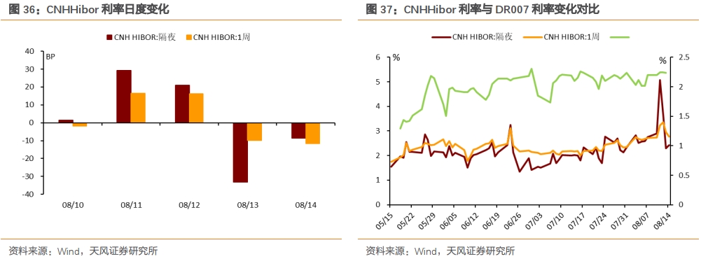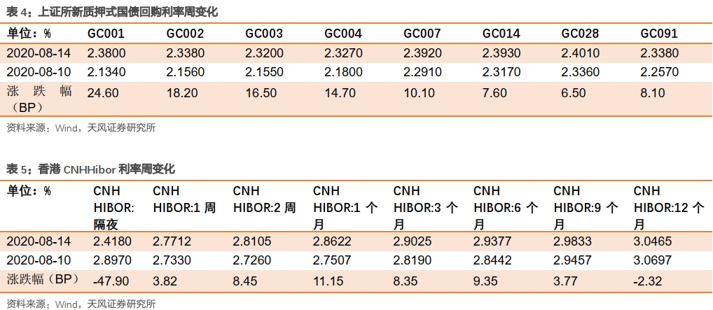 本周央行公开市场净投放4900亿元,资金面中性偏紧。银行间隔夜回购利率上行47BP至2.05%,7天回购利率上行17BP至2.20%;上交所质押式回购GC001下行22BP至1.97%;香港CNHHibor隔夜利率下行7BP至2.75%;香港CNH Hibor7天利率下行3BP至2.72%。