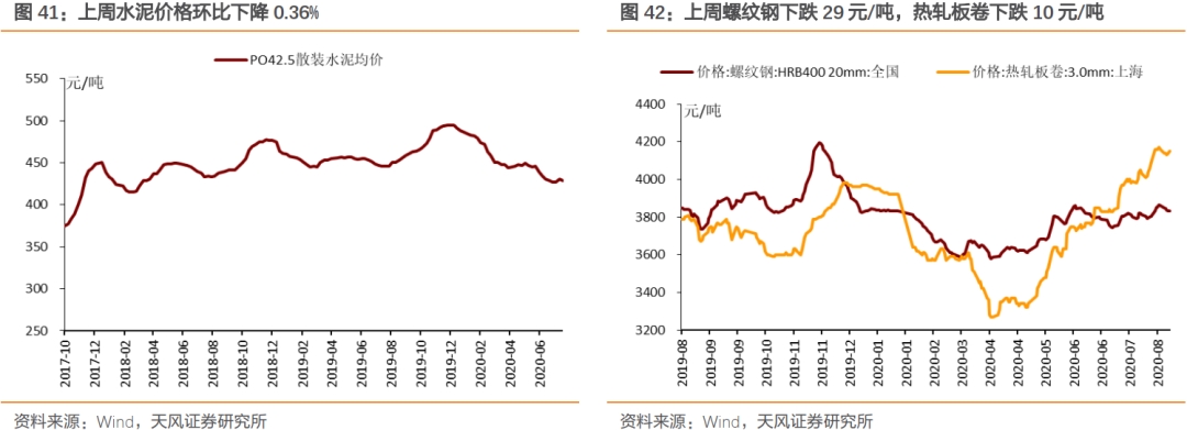 水泥:全国普通42.5级散装水泥均价为428.80元/吨,环比下降0.36%。