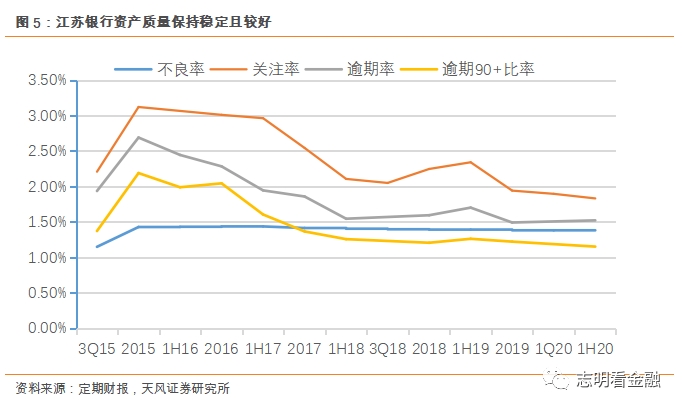 资产质量保持较好。由于江苏省疫情情况较好以及江苏银行受疫情冲击大的小微及个贷占比不高(1H20普惠小微贷款余额764亿元),资产质量受疫情冲击有限。1H20不良贷款率1.37%,较年初下降1BP;关注贷款率1.83%,较年初下降11BP;逾期贷款率1.52%,较年初上升3BP。江苏银行经营范围主要在长三角,近年来资产质量持续改善。