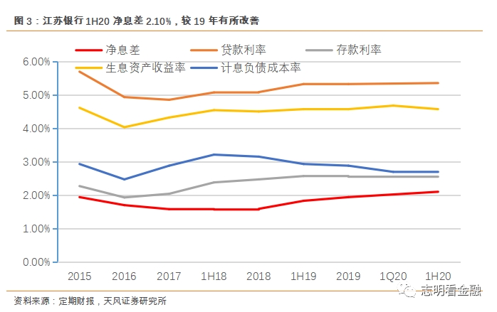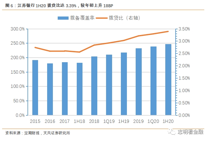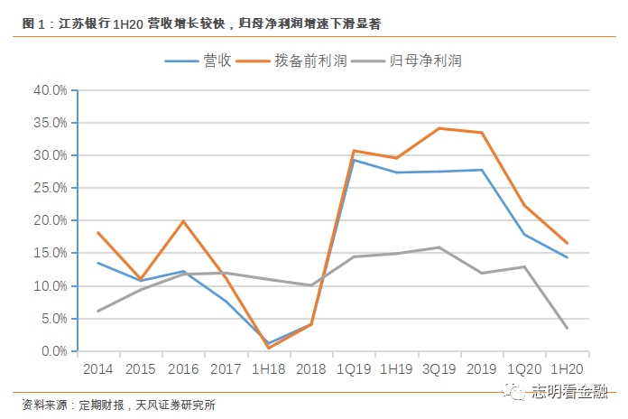 净利润增速下滑明显。由于1H20商业银行净利润增速仅-9.4%,较1Q20的5.0%大幅下降,市场对上市银行中报净利润增速下降有较为充分的预期。江苏银行1H20净利润增速3.5%,较1Q20的12.8%明显下降,这主要是提前加大拨备计提所致。1H20拨备前利润增速达16.5%,维持较高增速。