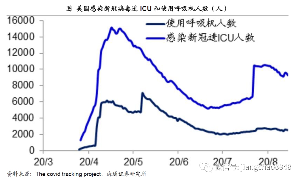 无论是感染新冠病毒住进ICU病房的人数,还是使用呼吸机的人数,目前都远低于4、5月份高峰时的水平,这意味着新冠病毒对医疗资源的占用也在明显下降。