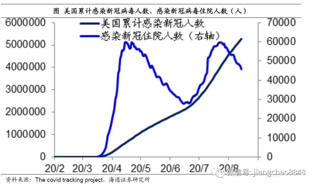 以美国为例,目前美国是全球感染新冠病毒最多的国家,其累计感染人数已经超过500万人,而且每周的新增感染人数依然维持在40万人左右的历史高峰。但是由于治疗水平等的进步,美国感染新冠病毒住院的人数已经从4月份6万人左右的高峰下降至当前的4.6万人。