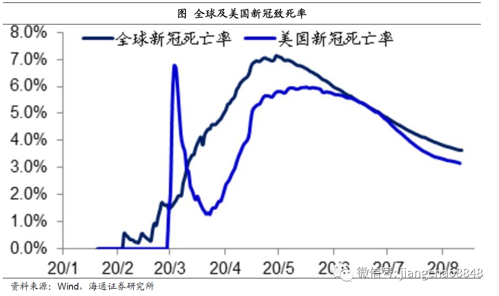 一方面是新增感染人数上升,另一方面是新增死亡人数的下降,结果就是感染新冠病毒的死亡率大幅下降。目前全球新冠病毒致死率已经从峰值的7%降至3.6%,美国也从6.7%降至了3.2%,这已经远低于2003年SARS高达11%的死亡率。