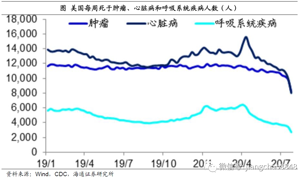而且根据美国CDC6月份的《发病率和死亡率周报》,在统计了130万新冠病例之后,发现患有心脏病等慢性病患者死于新冠病毒的风险比健康人高出12倍,这意味着很多死于新冠病毒的患者本身可能也患有各种慢性疾病,其结果就是在7月份以后死于心脏病、肿瘤等慢性疾病的人数出现了明显下降。