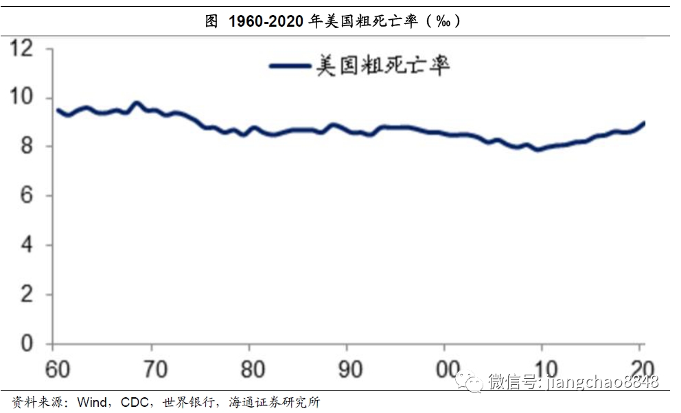即便是放在过去60年的背景下来观察,今年美国的粗死亡率也并未显示出明显的异常,位于8.8‰的历史平均水平附近。
