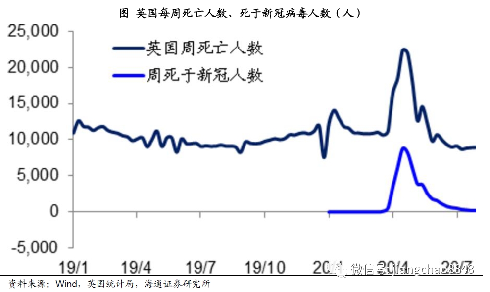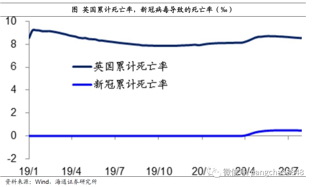 从我们测算的英国人口累计死亡率来看,由于新冠病毒的影响,英国的人口死亡率从8.1‰最高升至8.7‰,但并未明显偏离正常年份的死亡率,而且目前已经重新开始下降。
