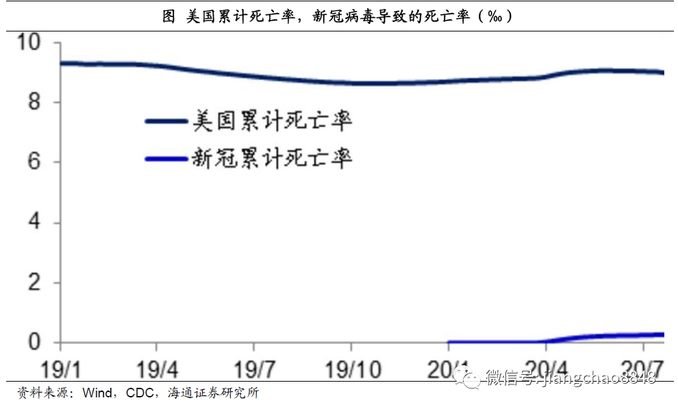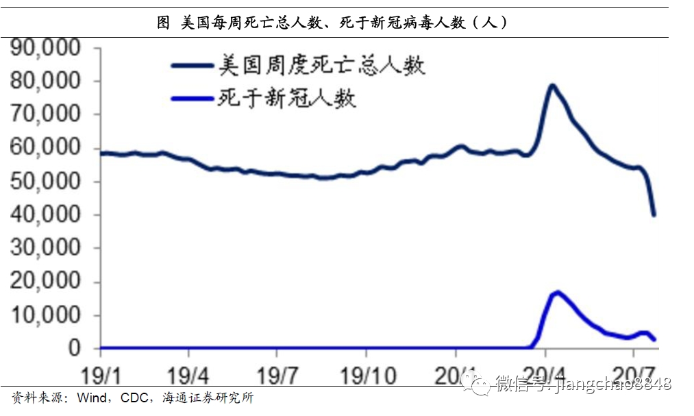 因此,虽然新冠病毒在4、5月时导致了美国每周死亡人数从6万左右最高升至8万人,但在进入7月以后,由于死于各种慢性疾病人数的大幅下降,美国每周总死亡人数已经降至4万人。因此从累计的角度来看,美国今年的总死亡人数相比于正常年份并没有大幅增加。