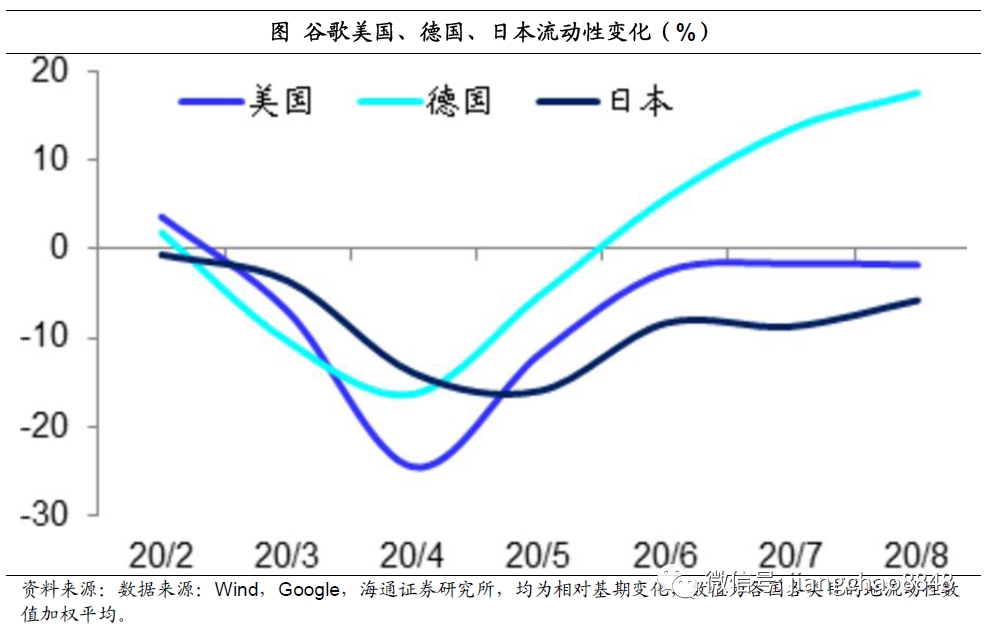 新冠疫情对经济的影响主要体现在人口流动性下降,减少了经济活动和产出。谷歌在今年推出了人口流动性报告,追踪各国的流动性变化。美国、日本和德国的数据显示,疫情导致流动性冻结最严重的时期是今年的4、5月份,这恰好也对应了上述全球和美国的新冠死亡率的顶峰时期。而从5月份开始,美日德各国的人口流动性已经先后出现了改善,并且一直持续至今。其中德国的总体流动性已经超过了2月份的基期,而美国和日本也恢复到接近2月份的水平。