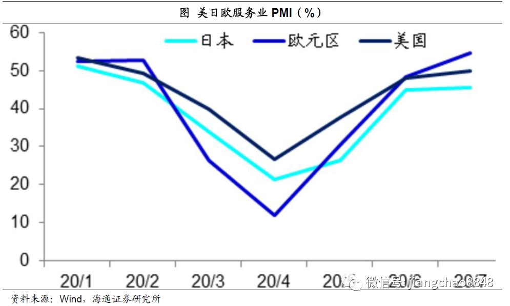 即便是受疫情影响最严重的服务业,随着人口流动性的改善,在5月份以后美日欧的服务业PMI指数也开始持续回升,7月份美欧的服务业PMI均超过50,而日本也升至45.4。
