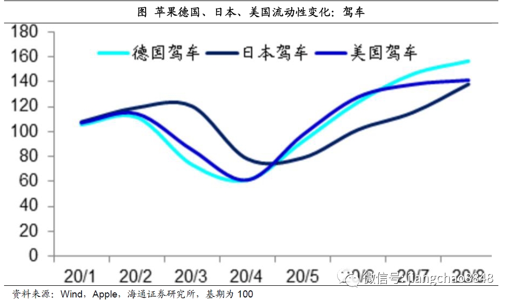 在今年1月份,苹果也推出了流动性报告,其主要监测的是各国驾车、乘坐公交或者徒步出行的比例变化。数据显示,今年4、5月份是美日德各国流动性的最低点,从5月份开始流动性出现明显改善,目前美日德三国驾车出行的比例已经显著超过了1月份的水平。