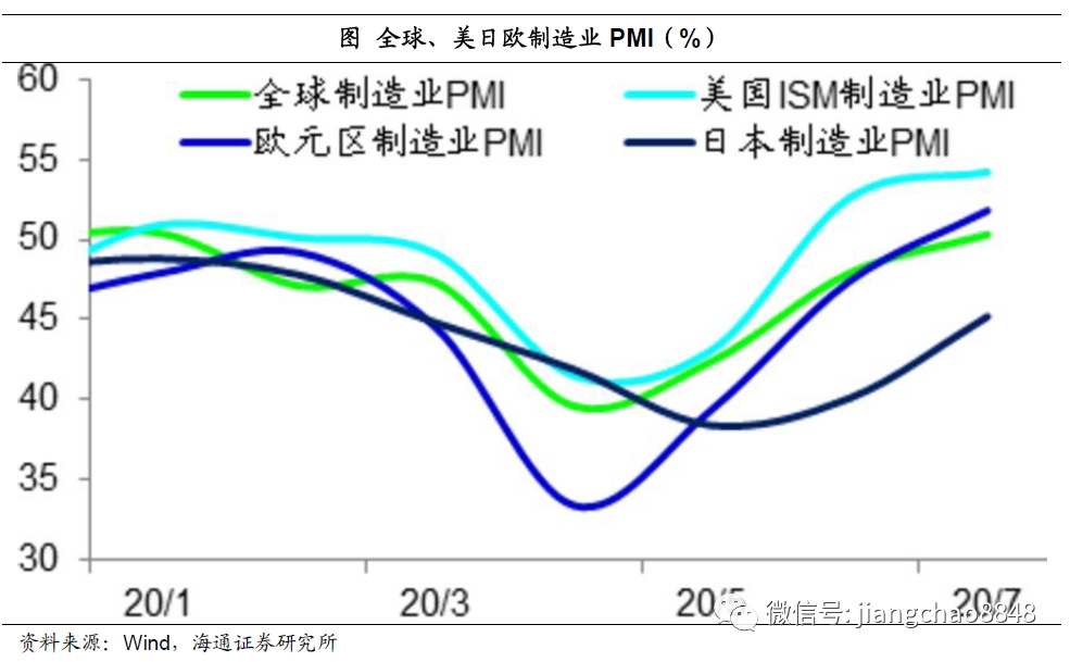 人口流动性的变化直接影响到了经济的变化。在4、5月全球流动性冻结最严重的时期,也是全球经济衰退最严重的时期,当时全球以及美日欧的制造业PMI指数均大幅跳水。但之后随着人口出行的逐渐恢复,全球经济已经悄然进入了复苏模式,到7月份,除了日本以外,美欧的制造业PMI指数均回升到了50以上的扩张区间,全球制造业PMI指数也首度回升到50以上。