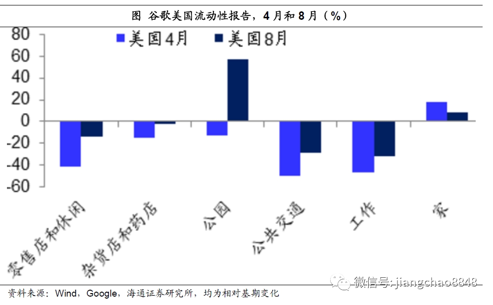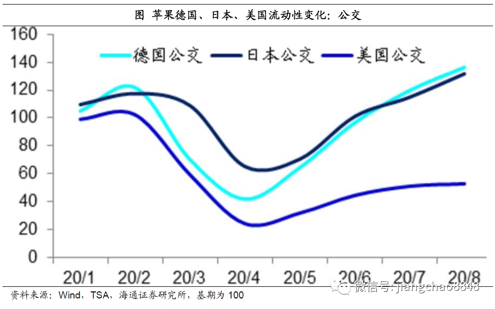 而从乘坐公交的数据来看,美日德的流动性低点同样是在今年4月份,之后就开始持续恢复。到8月初,日本和德国乘坐公交的比例已经比1月基期高出30%,只有美国依然低于1月份的基期,但也在持续改善。