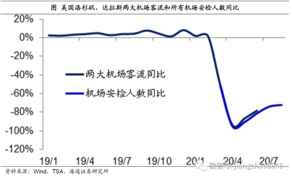 在所有出行当中,冻结最严重的当属飞机出行。我们统计美国洛杉矶和达拉斯两大机场的客流数据,在4月份疫情最严重的时期,其客流同比降幅超过90%,同期美国所有机场安检人数同比降幅超过95%。而从5月份开始,机场客流开始缓慢恢复,进入8月份以后,美国机场安检人数同比降幅已经缩窄到70%左右。