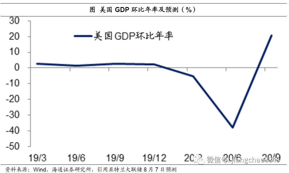 消费是美国经济的主体,7月份以来美国的就业和消费持续改善,预示着3季度美国经济有望明显复苏。美国亚特兰大联储8月7日的预测显示,3季度美国GDP环比年率有望达到20.5%,这意味着美国3季度有望出现强劲复苏。