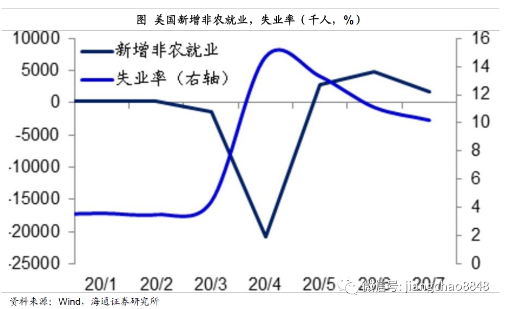 随着人口出行的增加和经济活动的恢复,美国的就业也开始改善。在疫情最严重的4月份,美国减少了约2100万个工作,但从5月份开始,美国3个月内恢复了927万个工作机会,其失业率也从最高的13.3%降至10.2%。