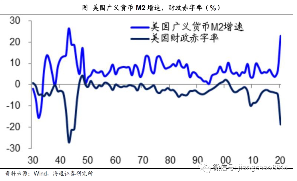 与此同时,为了应对疫情的冲击,全球主要国家都出台了史无前例的财政和货币刺激政策。以美国为例,到目前为止,已经出台了4轮财政刺激计划,合计的财政刺激总规模达到3万亿美元,占美国19年GDP的比例接近15%。目前新一轮财政刺激计划正在讨论当中。为了配合财政刺激,美联储出台了不限量的量化宽松货币政策,今年以来购买了近3万亿美元的资产,其中主要就是购买美国国债。在巨额的财政和货币刺激之下,美国的广义货币M2增速已经创出了23%的76年新高。