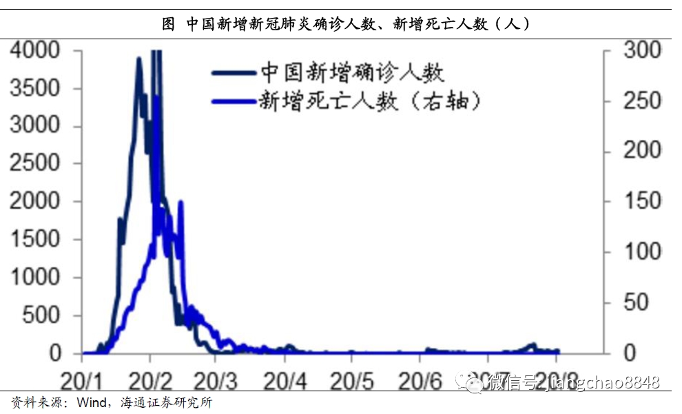无论是从新增感染新冠肺炎的人数、还是新增死于新冠肺炎的人数,中国都是在2月份达到高峰、在3月中旬以后就持续位于低位水平,这意味着中国疫情的顶峰发生在2月份,在3月份以后疫情就开始持续改善。