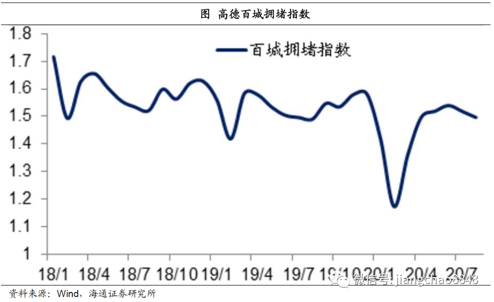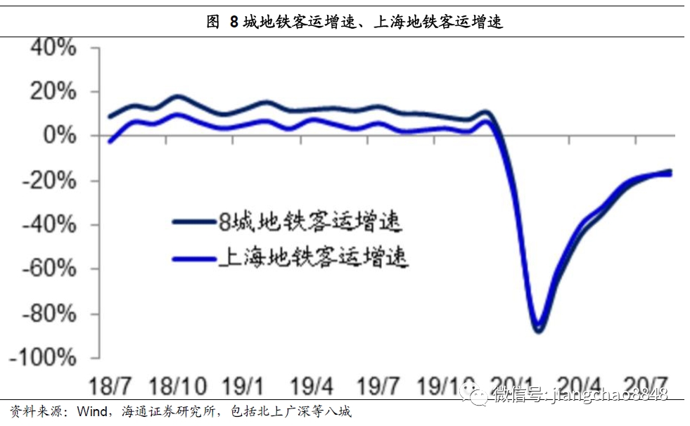 随后,以地铁为代表的市内公交出行也开始明显恢复。我们统计的北上广深等8城地铁客运数据显示,2月份的8城地铁客流同比降幅超过80%,到8月初的同比降幅已经不到20%。