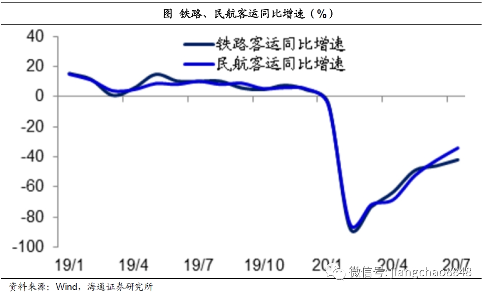之后,远途出行的铁路和民航客流也开始恢复。今年2月份,中国民航客运同比降幅高达84.5%,铁路客运同比降幅高达87.2%,到7月份的全国民航客运同比降幅缩窄至34.1%,铁路客运同比降幅缩窄至40%左右。