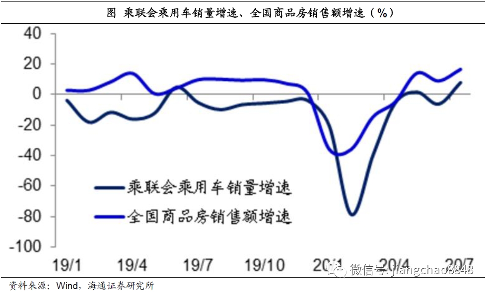 住房和汽车是最大的两类可选消费,我们看到,从3月份开始,这两大可选消费的降幅开始缩窄,而且住房消费的复苏还要领先于汽车消费,4月份全国商品房销售额同比增速就率先由负转正,到7月份的增速已经升至16.6%,而7月的全国乘用车销售增速也达到7.7%。