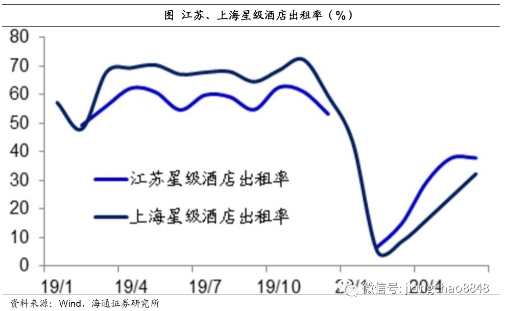 伴随着远途出行的恢复,酒店出租率也开始回升,江苏和上海的星级酒店出租率在2月份最低的时候只有5%左右,到6月份均恢复到了30%以上。