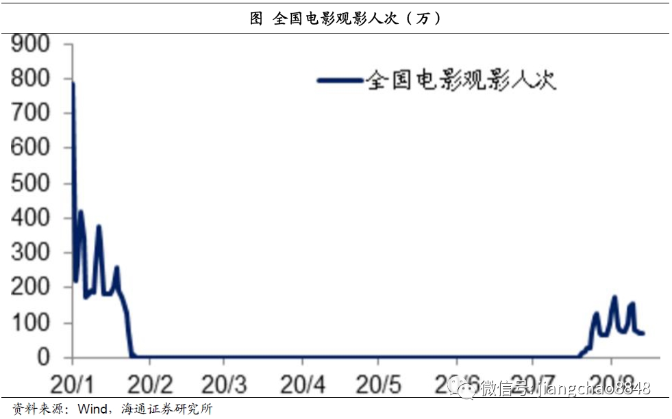 而即便是人流最密集的电影行业,在7月下旬也开始逐渐解封,观影人次开始逐渐恢复,8月以来的日均观影人次约为100万,相当于去年同期的14%左右。