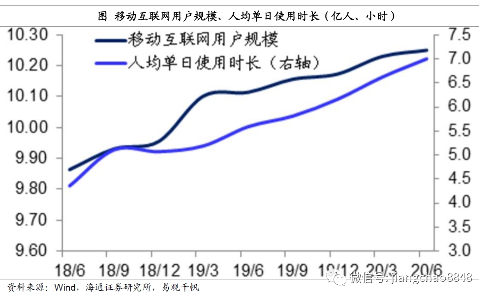 随着人口出行的恢复,中国经济也开始了复苏。在所有行业中,表现最好的是网上经济,因为其完全不受疫情导致的出行限制的影响。易观千帆的数据显示,无论是我国的移动互联网用户规模还是人均单日使用时长,均在20年上半年持续增长。