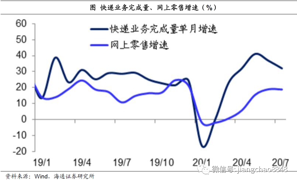 网上经济蓬勃发展的一个重要体现是网上零售的高增长。今年的网上零售只是在前两月出现了小幅的负增长,在3月份的增速就由负转正,到7月份的增速已经接近20%。与之相对应的是,全国快递业务完成量在1月出现了负增长,但2月就由负转正,4月以来的增速均超过30%。