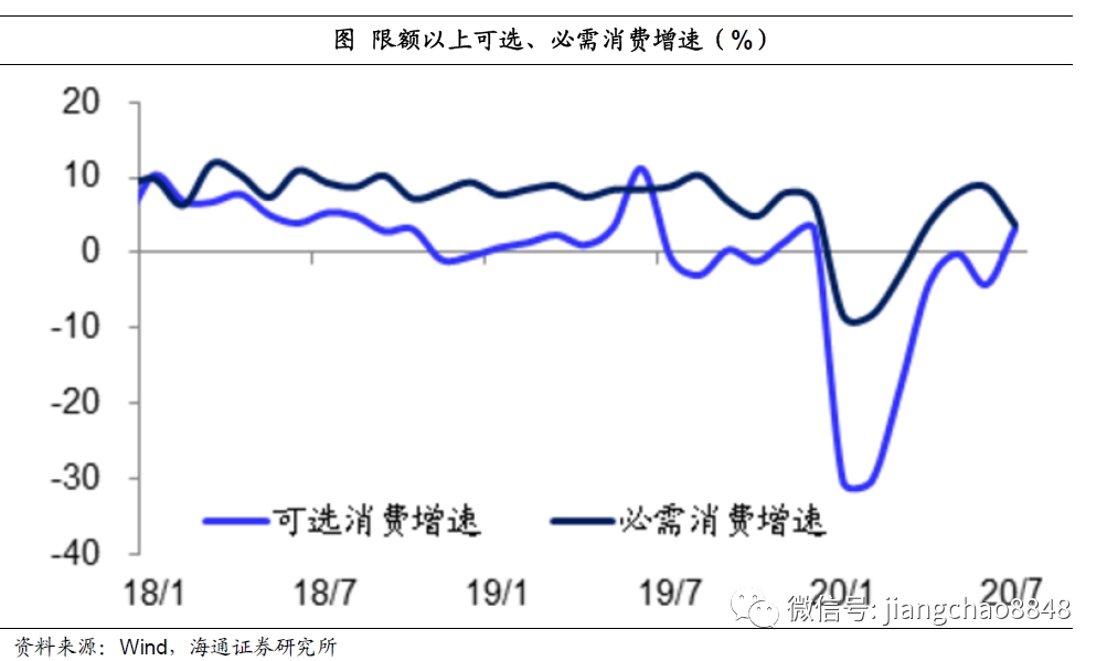 在传统经济中,最早复苏的是必需消费,主要包括食品饮料、服装和日用品等。虽然在疫情期间限额以上必需消费也一度出现了个位数的下降,但从4月份开始必需消费增速就率先由负转正。包括汽车、家具、家电在内的可选消费受到疫情的冲击相对较大,今年前两月的限额以上可选消费降幅超过30%,而且在整个上半年都维持了负增长。但在7月份,得益于汽车消费的大幅回升,可选消费增速也由负转正。