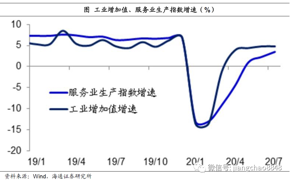 经济复苏的另一个印证是生产的回升,无论是工业还是服务业生产指数,均从3月份开始回升。其中工业增速在4月份就率先由负转正,而服务业生产指数增速也在5月份转正,并且持续回升至7月份。