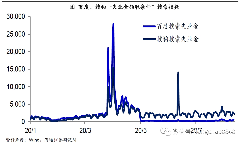 但如何印证服务经济的复苏?服务业主要是与人有关的经济,因而就业数据是服务业发展的重要验证。从百度和搜狗等搜索引擎中“失业金领取条件”关键词的搜索频率来看,最高峰的时期是在今年的3月末和4月初,此后搜索频率开始持续下降,这意味着4月以后中国的就业市场就出现了改善。