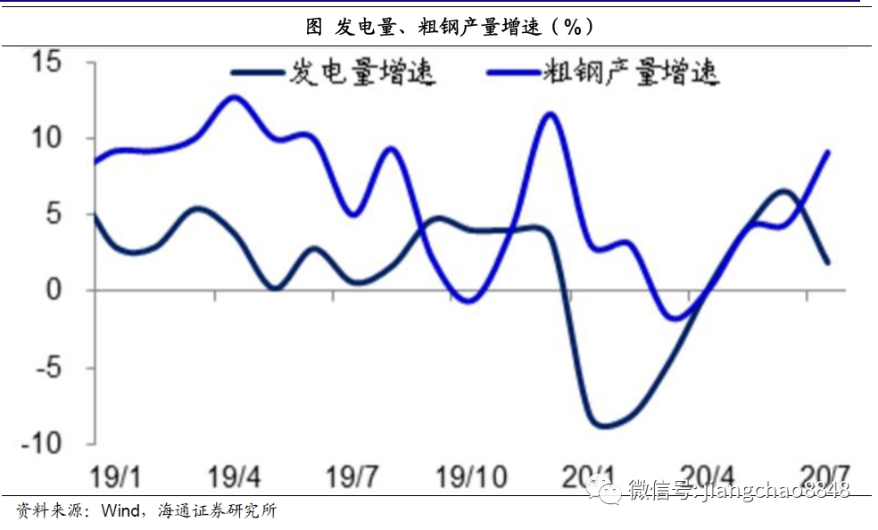 而生产的回升也得到了微观数据的印证。在所有实物指标中,最重要的是发电量增速,因为所有行业几乎都需要用电。发电增速在今年前两月的降幅高达8.2%,但4月份以后的发电量增速就回到了正值区间。此外,粗钢产量增速也在4月份以后转正,并且在7月份创出9.1%的年内新高。