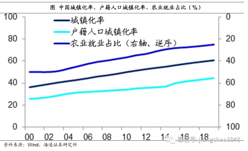 虽然大家都不太喜欢房地产拉动经济发展的模式,但现实的情况是,中国的房地产周期依然没有结束。从长期来看,中国目前的城镇化率为60%,而成熟期的城市化率通常为80%以上。目前中国农业就业人口占比超过20%,未来随着农业就业人口占比的进一步下降,城镇化率仍有提升空间。与此同时,由于户籍制度的限制,目前我国的户籍人口城镇化率仅为44%,而随着政府放开中小城市落户的限制,户籍人口城镇化率提升的空间更大,这有助于都市圈和城市群的发展。