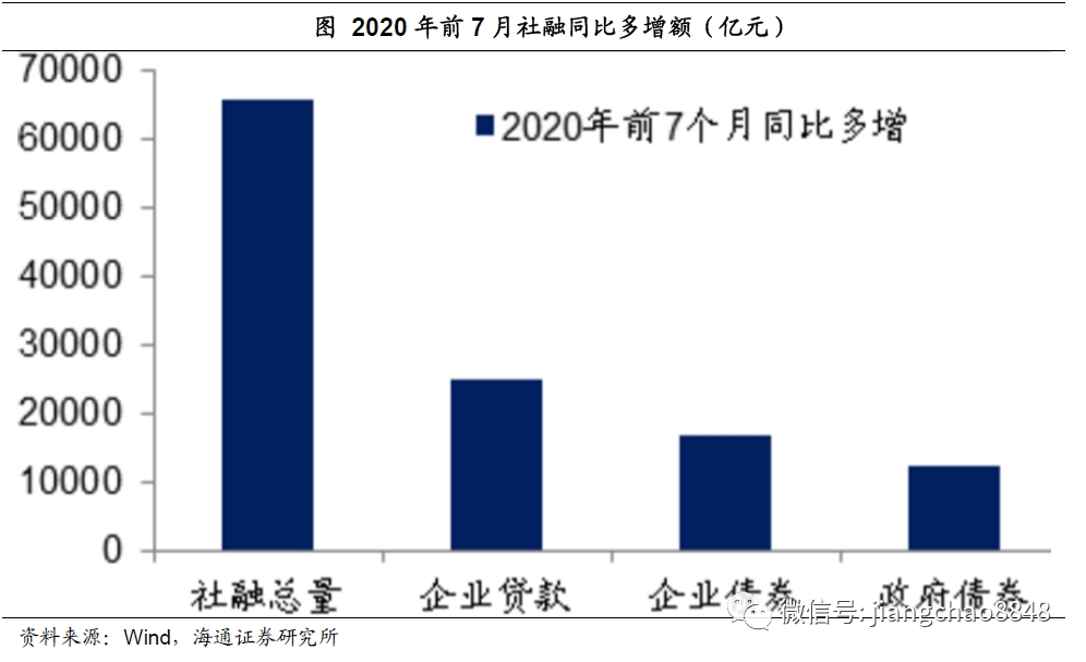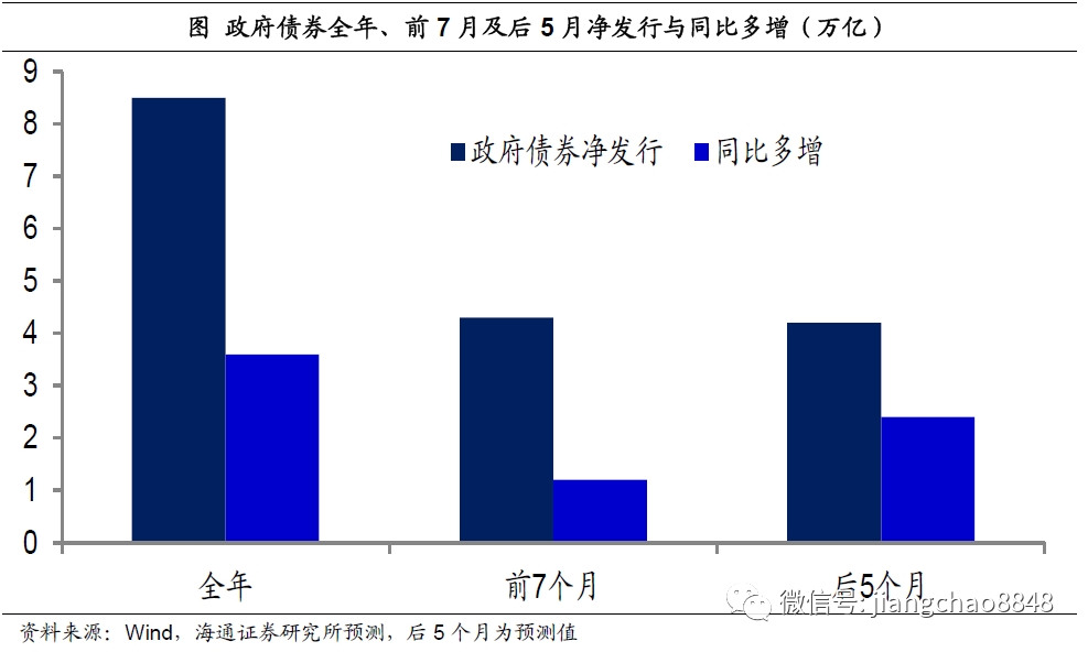 但是按照今年两会的财政预算,全年政府债券的净发行规模为8.5万亿,同比多增额为3.6万亿。而今年前7个月的政府债券总发行规模为4.3万亿,这意味着后5个月政府债券总发行规模也将达到4.2万亿,同比多增额高达2.4万亿,政府融资的大幅多增将拉动社融增速继续回升。