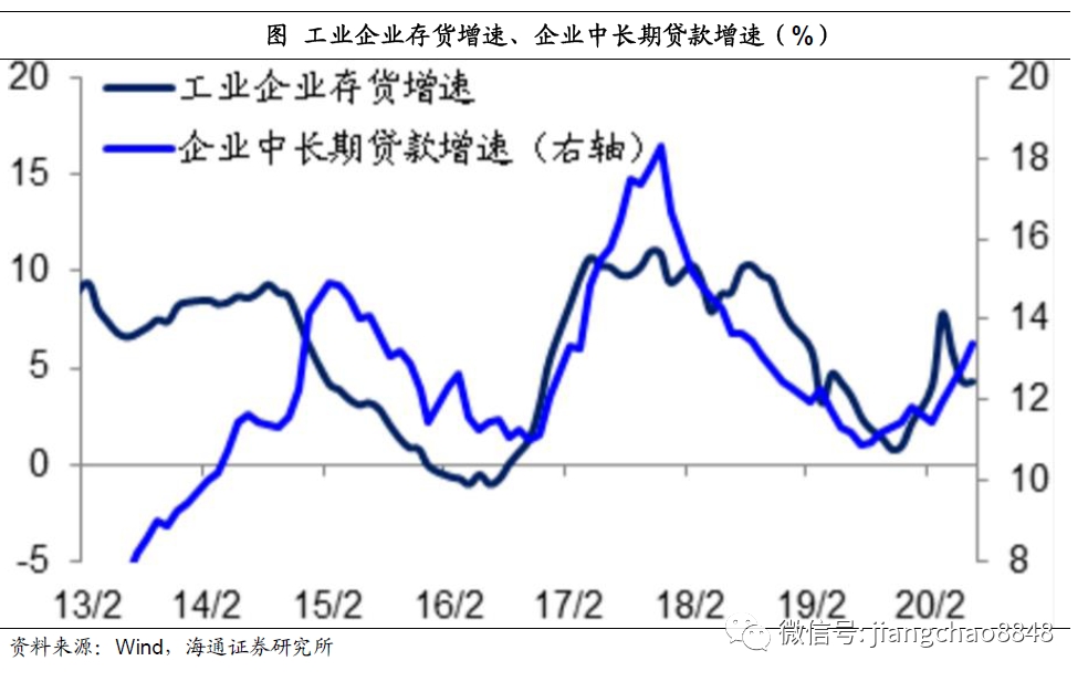 最后,中国企业的中长期贷款增速与库存周期高度相关,本轮库存周期的起点其实在19年年中,虽然由于新冠疫情的爆发,库存周期的回升短期中断,但在目前疫情得到控制之后,库存周期有望恢复,从而支撑企业中长期贷款的回升。