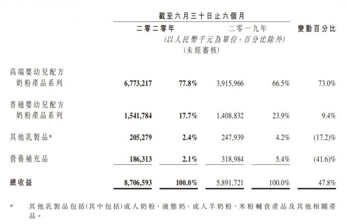 其中,报告期内高端婴幼儿配方奶粉产品系列实现营收67.73亿元,同比增长73%,占总收入比重从2019年同期的66.5%进一步提升至77.8%。而普通婴幼儿配方产品、其他乳制品以及营养补充品等表现不一,同比增长率分别为:9.4%、-17.2%以及-41.6%。