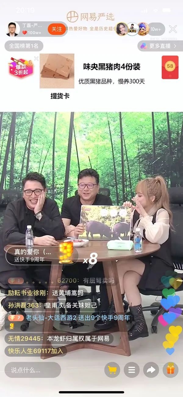 和雷军不同,网易CEO丁磊在快手直播带货首秀时话少得可怜,他的两个搭档,华少嘴快,蛋蛋话多。网友称,丁磊感觉像是“吉祥物”,插话都插不进来。在抖音直播时,丁磊搭档果断换人,换成了乘风破浪“小姐姐”。