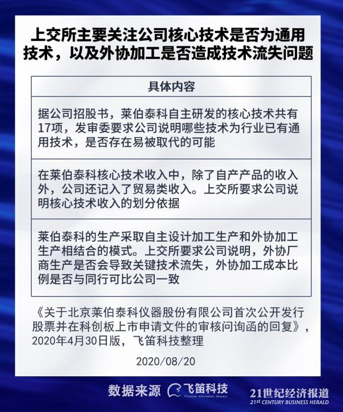 此外,在公司核心技术收入中,还记入了贸易类收入。据公司招股书,公司核心技术收入主要包括自产产品和贸易类产品收入。2017年至2019年,按莱伯泰科计算的核心技术收入口径算,公司核心技术收入占营业收入的比例分别为99.5%、99.4%和99.5%,若剔除贸易类收入,公司核心技术收入占营业收入的比例则下降到65%、66.3%和59.4%。因此,发审委要求公司说明核心技术收入的划分依据。