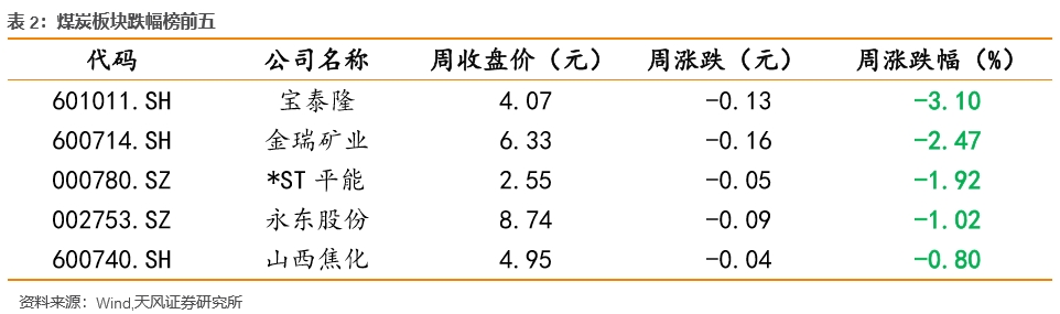 上周煤炭板块跌幅榜前五的为宝泰隆、金瑞矿业、*ST 平能、永东股份、山西焦化跌幅为-3.10%,-2.47%、-1.92%、-1.02%、-0.80%。