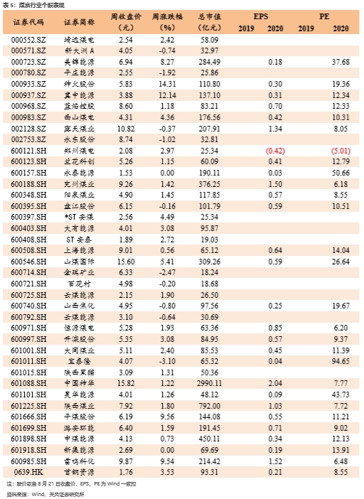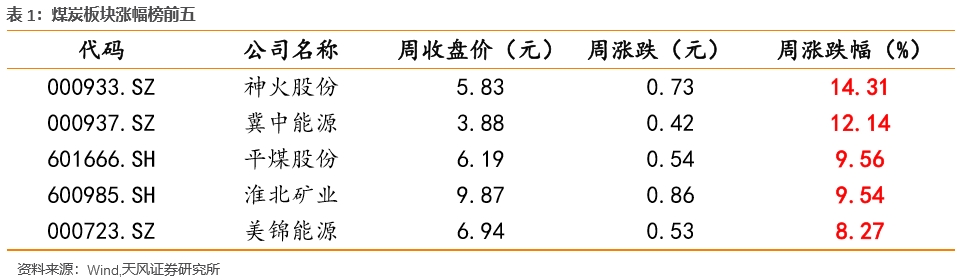 上周煤炭板块涨幅前五的分别为神火股份、冀中能源、平煤股份、淮北矿业、美锦能源涨幅分别为 14.31%%、12.14%、9.56%、9.54%、8.27%。