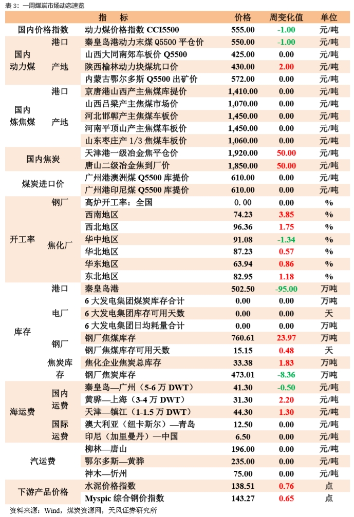 本周观点:动力煤:供给方面,鄂尔多斯伊旗部分矿近期煤管票增加供应后产量增加,而其他矿区余票不多,下周可能会停产;陕西、山西地区供应稳定;需求方面,目前华东华南等多地还处于高温天气,尽管电厂库存有所下降,但仍以去库存为主。部分电厂有招标释放,但是压价较低,叠加局部地区水泥错峰生产,水电运行情况良好,对火电形成制约,整体需求不强。港口煤炭库存有所下降;总体来看,煤炭供给偏紧,下游需求整体不强。随着部分地区高温天气的持续,我们预计短期内煤炭市场将平稳运行,后期需关注下游电厂补库存情况。焦煤:供给方面,国内煤矿、洗煤厂开工率仍高;需求方面,下游焦化厂炼焦煤库存以及平均可用天数都有所上升。总体来看,本周炼焦煤市场平稳运行,我们预计短期内焦煤价格将平稳运行,后期需关注下游焦炭需求情况。焦炭:供给方面,焦化厂生产相对高稳;需求方面,钢厂高炉开工高稳,本周钢厂库存有所下降,但仍居高位,近期以按需采购为主。焦化厂和港口库存都有所上升;总体看来,上游供给充足,下游库存有所上升,本周焦炭价格强势运行。受下游钢厂库存水平偏高影响,我们预计短期内焦炭或将稳定运行,后期需关注钢厂补库情况。