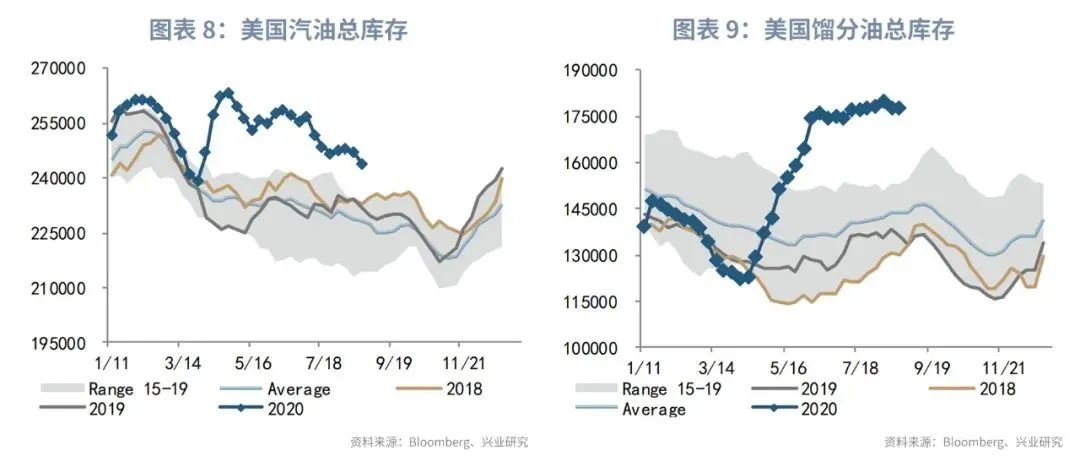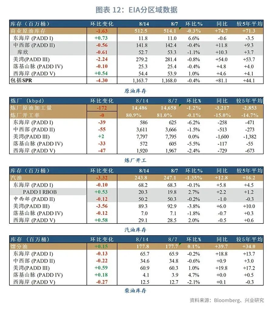 本周三公布的截至8月14日的EIA库存数据显示,美国原油库存减少163万桶至5.125亿桶,预期减少246.9万桶,前值减少451.2万桶。汽油库存减少332万桶至2.437亿桶。馏分油库存增加15万桶至1.778亿桶。进出口方面,本周原油进口量减少57.1万桶/天至597万桶/天,原油出口量减少6.5万桶/天至309.2万桶/天。汽油进口量增加11万桶/天至573.1万桶/天,汽油出口量减少增加100.6万桶/天至213.7万桶/天。需求方面,汽油需求环比减少25.3天至863万桶/天,柴油需求环比减少60.9万桶/天至325.3万桶/天,航空燃油需求环比减少0.7万桶/天至98万桶/天。